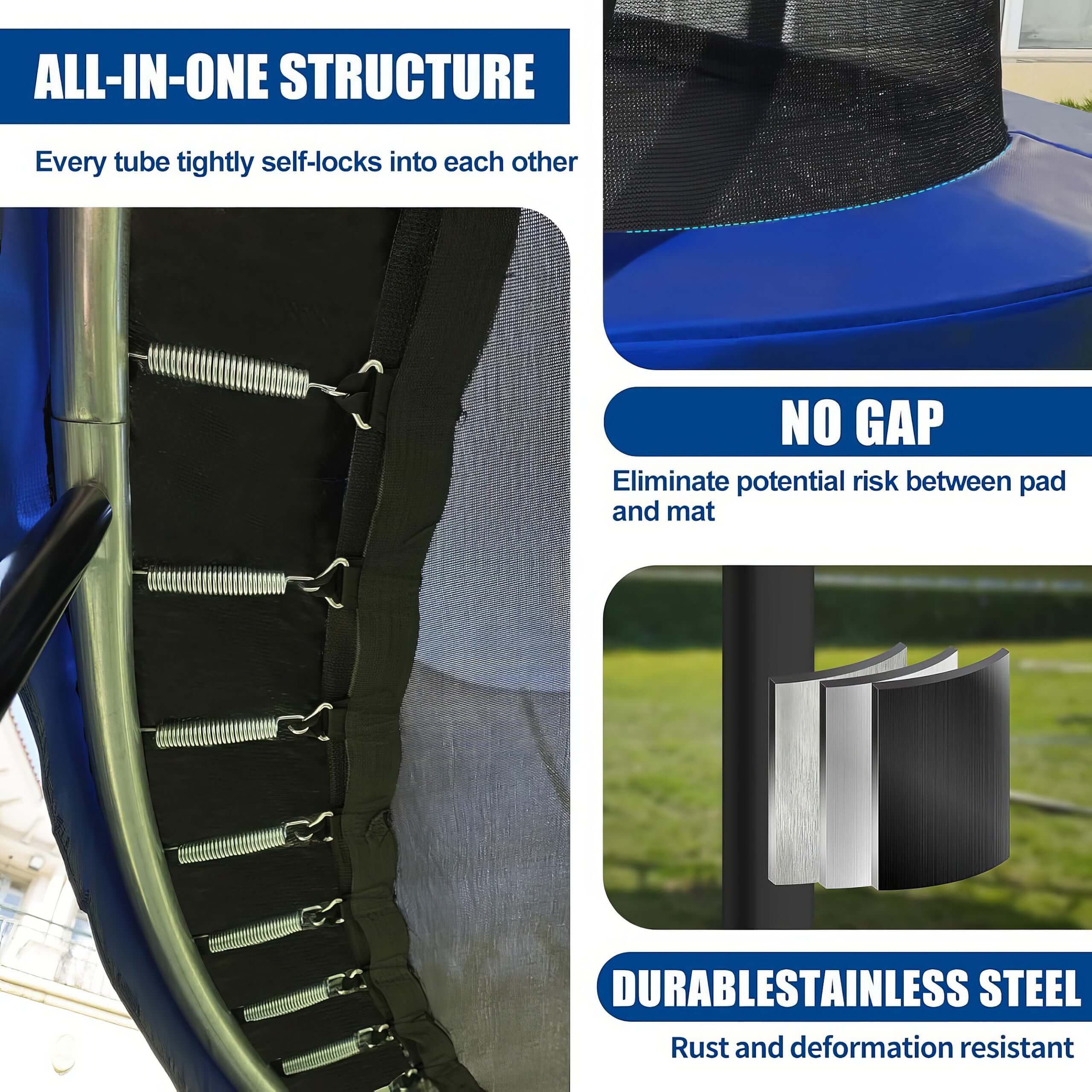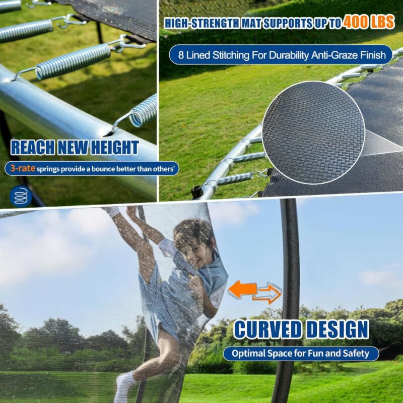 The frame is the foundation of any trampoline, and Wamkos gets it right. Instead of using thinner or uncoated steel found on budget models, this one is made from 1.3mm thick, fully galvanized stainless steel, and it’s spray-coated to resist rust over time. That extra thickness and coating help reduce flex and vibration, especially when the trampoline is loaded near its 400 lb weight limit. Four W-shaped legs distribute impact across eight contact points for added balance on uneven ground. Best of all, the bolt-free socket assembly eliminates a major headache during setup and even makes disassembly easier if you need to move or store it.
