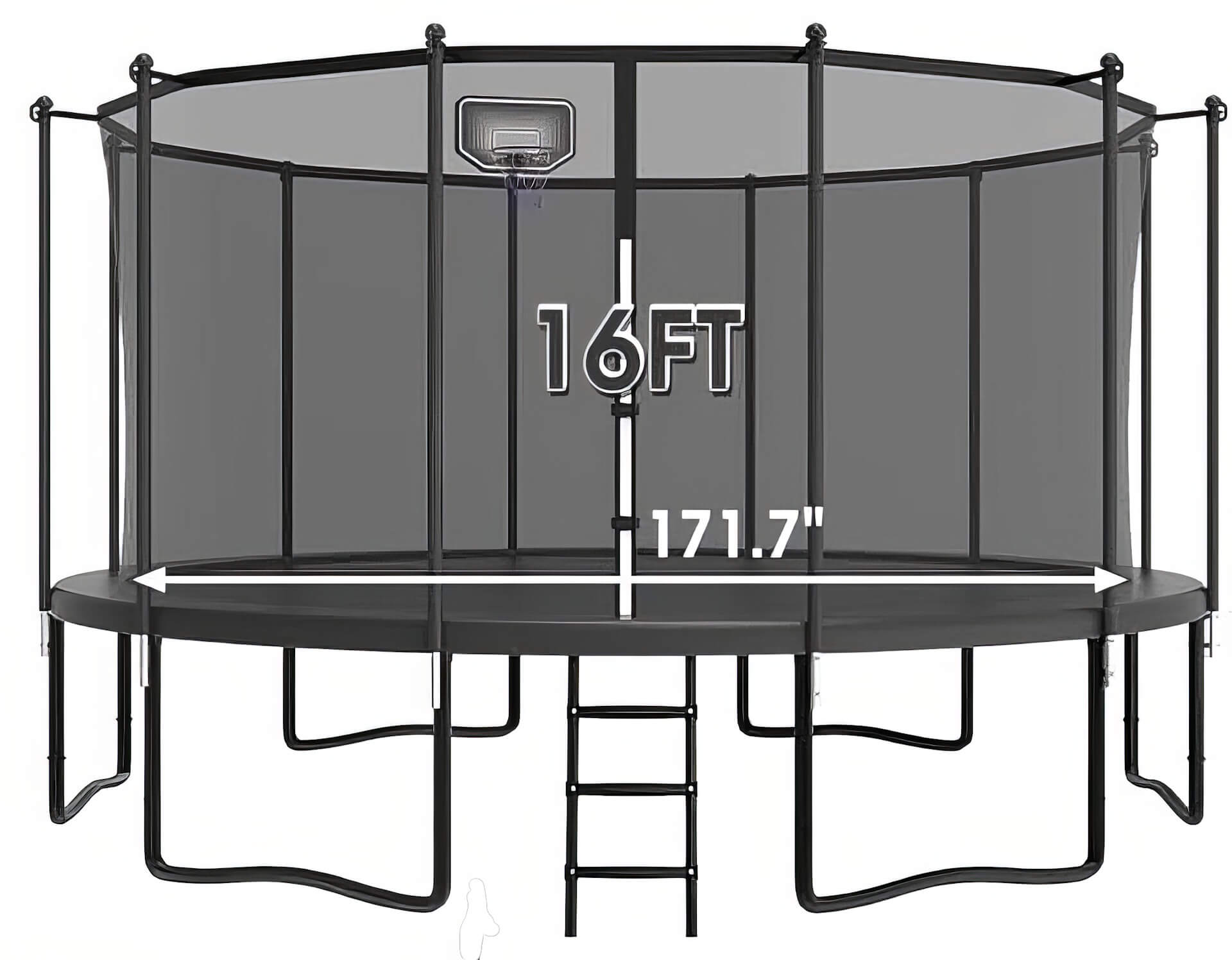 The 16‑ft model represents the pinnacle of the YORIN range, offering a massive 192.1‑inch jumping diameter and a 1500‑lb structural weight capacity that supports 8–10 children or 3–6 adults simultaneously. Fitted with 108 hot‑dip galvanized springs, this model ensures a lively and consistent rebound for an exhilarating bounce experience. Its 1.5mm thick galvanized steel frame with 6 W‑shaped legs and 12 safety poles provides exceptional sturdiness, while the high‑density safety enclosure offers reliable protection, making it perfect for large backyards where ultimate family fun is the priority.
